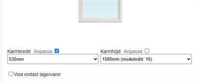 Då väljer du karmbredd 580mm och karmhöjd 1580mm i rullistorna och sedan klickar du i anpassa precis ovanför karmbreddsrullistan och nu väljer du 530mm.