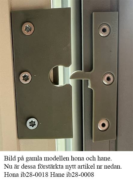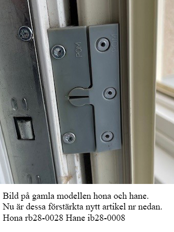 Passar till fönster från SP Fönster och Traryd Fönster Intakt och Objekt/KFI 2+1 tillverkade efter oktober 2009. Konstruktionsändrad förstärkt variant som kräver att du även byter honan om du har den äldre varianten. Blindnitarna finns som separat reservdel. Passar även Mockfjärds fönster med ovanstående beskrivning. Art nr ib28-0008